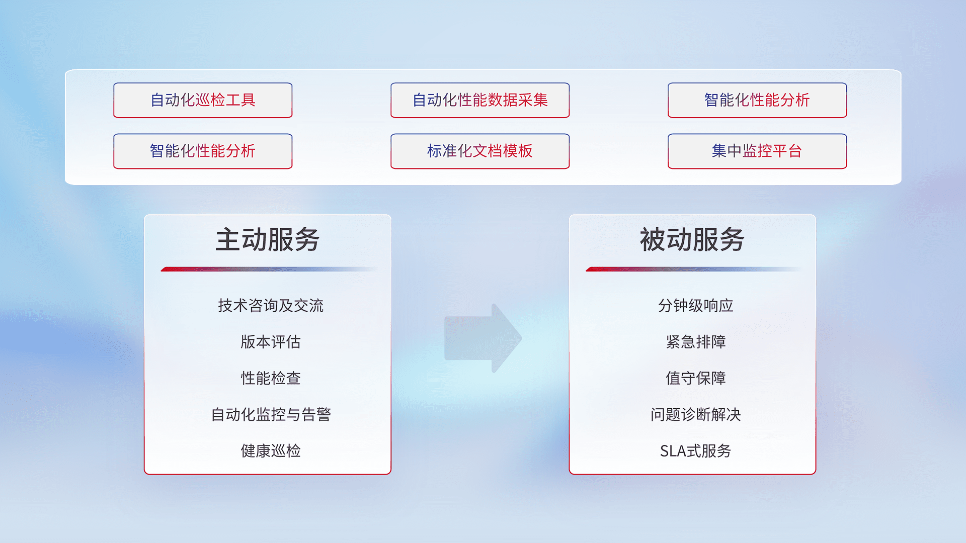 智能化工具和标准化文档,,,保障服务质量,,提供主动服务(包含技术咨询、、版本评估、、、、性能检查、、自动化监控与告警、、、健康巡检)和被动服务包含(分钟级响应、、、、紧急排障、、、、值守保障、、、问题诊断解决、、、、SLA服务)。。。。